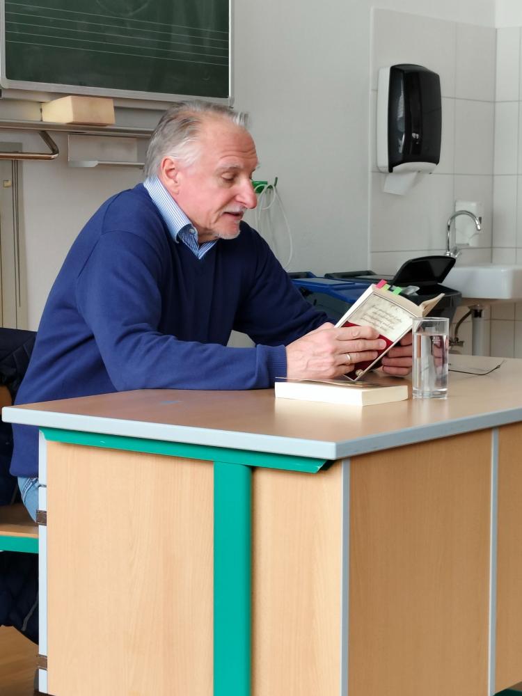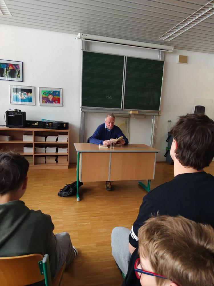 Vor den rund 14‑jährigen Schüler*innen präsentierte Siegel zwei sehr unterschiedliche Werke aus seinem literarischen Schaffen: