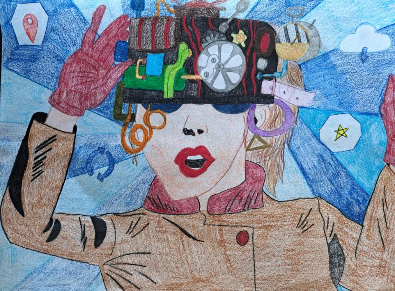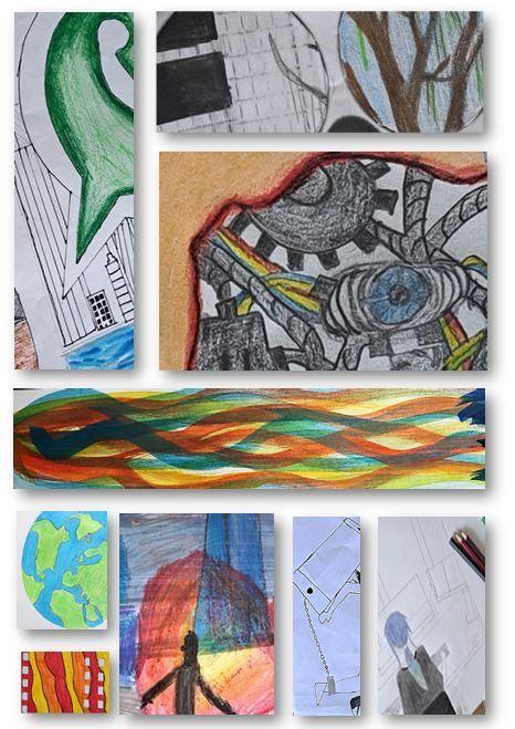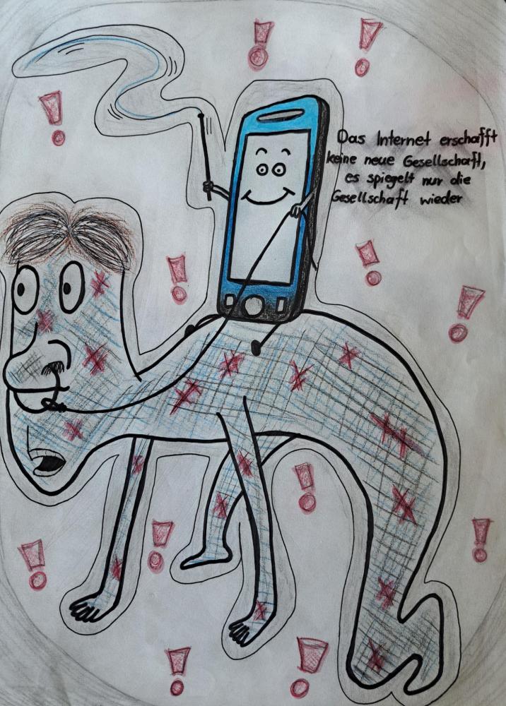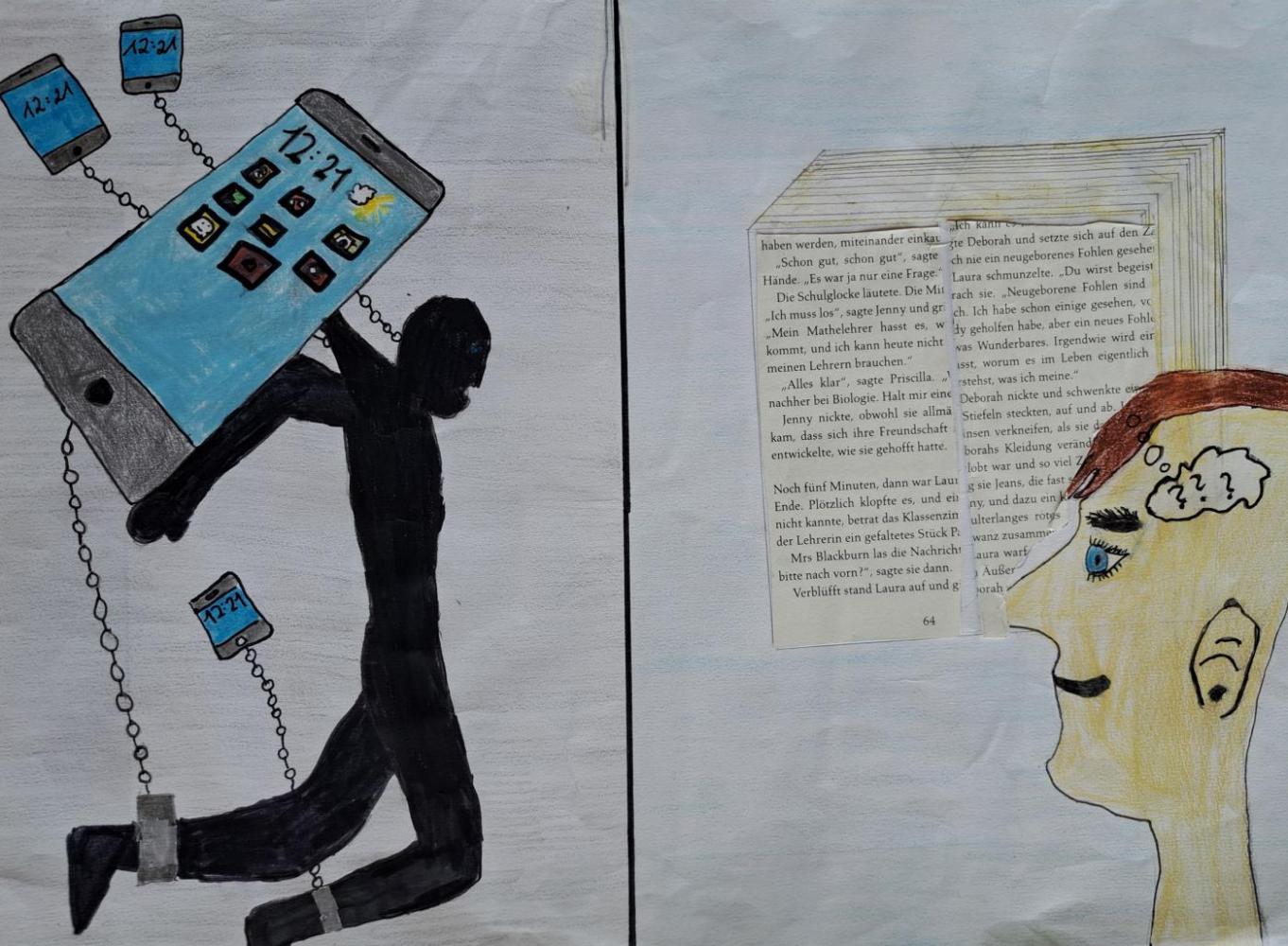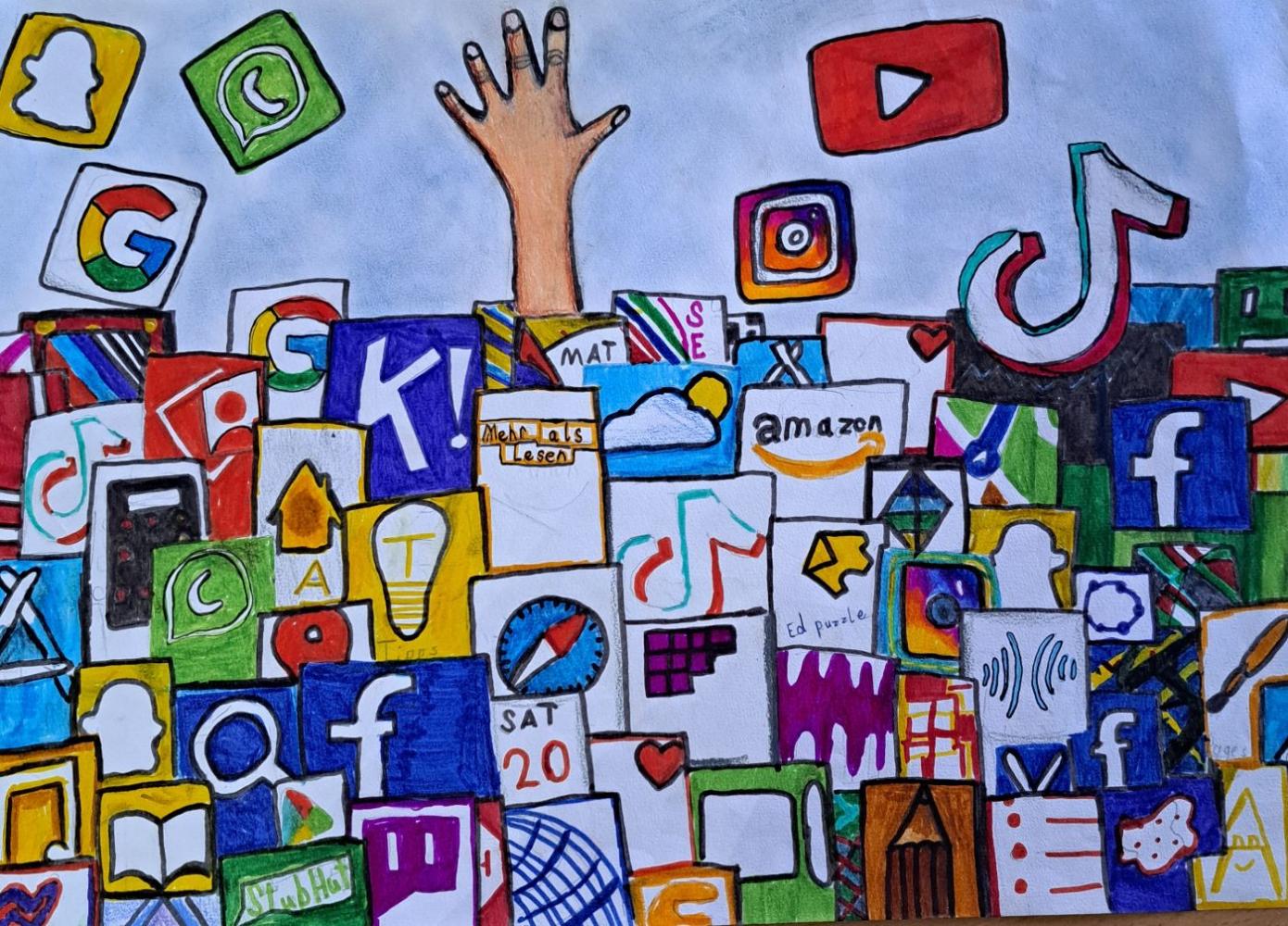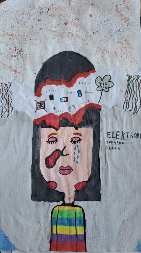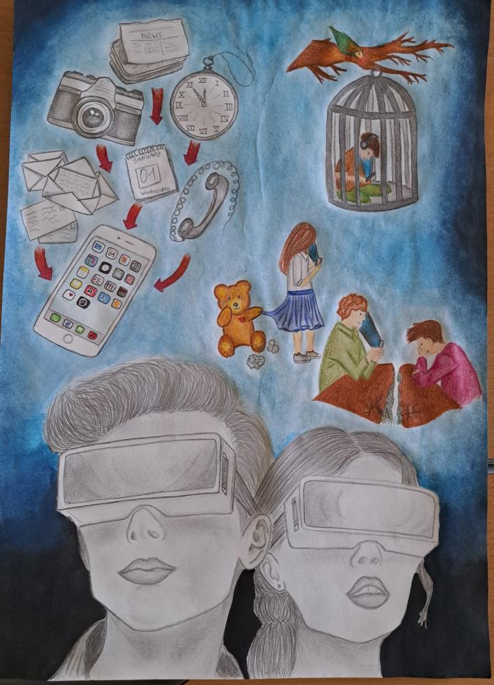 Es entstanden interessante Werke, die die heutige digitale Welt präsentieren. Roboter, durch Apps manipulierte Menschen, Virtual-Reality-Brillen, aus dem Handy herauswachsende Städte, verzerrte Wahrnehmung des eigenen Körpers durch Vorgaukeln illusionierter makelloser Menschen, Einsamkeit, die durch Vereinsamung durch die alleinige Nutzung digitaler Medien entsteht… Unsere SchülerInnen kennen sich aus in der digitalen Welt!