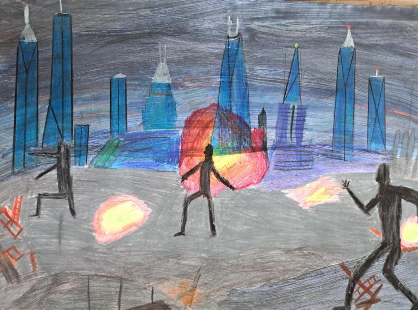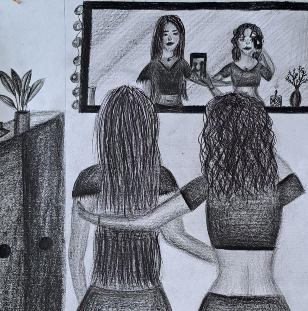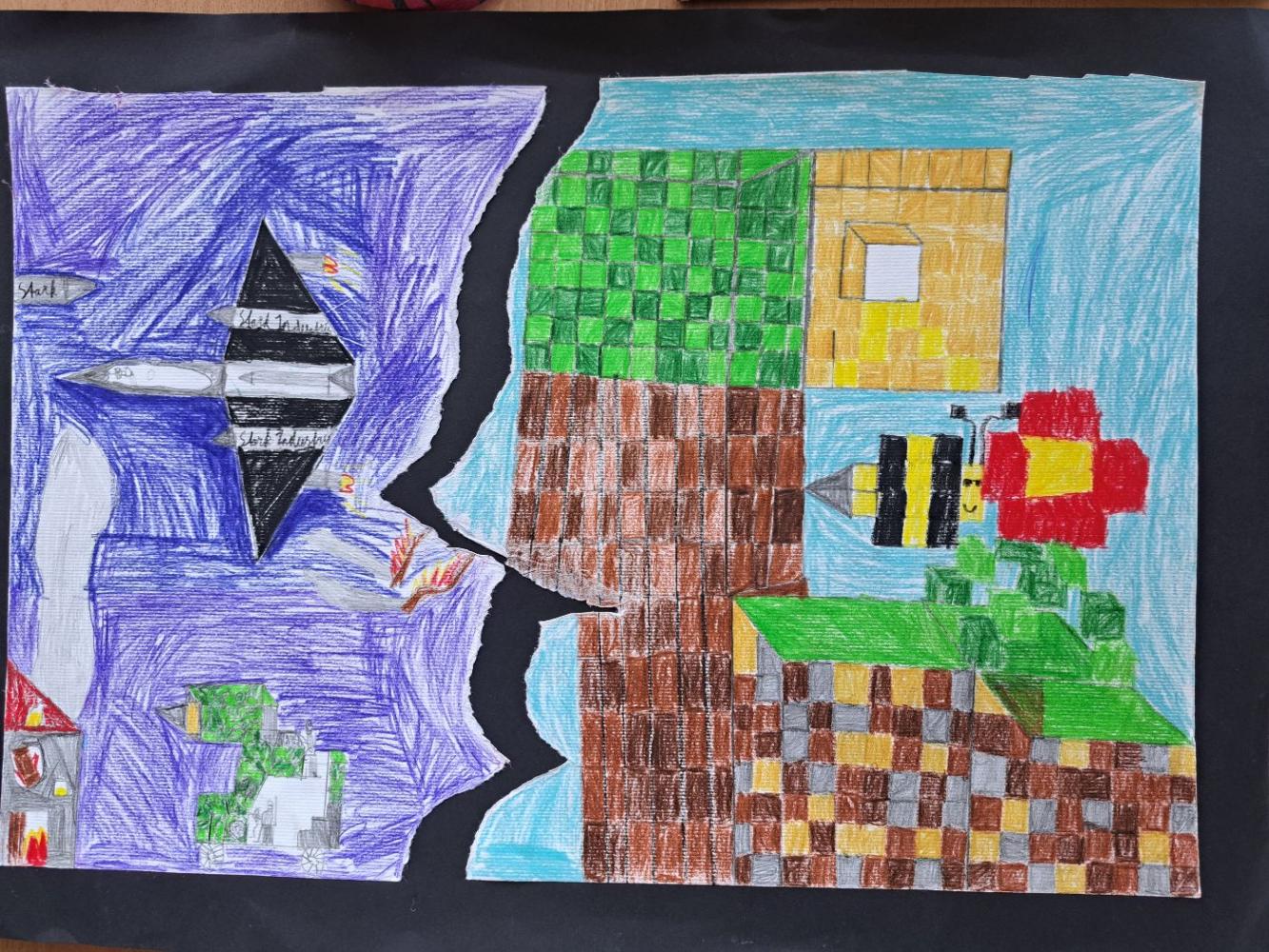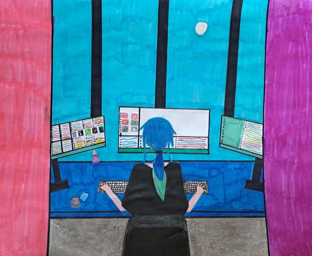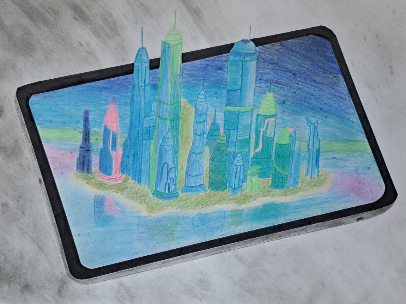 Es entstanden interessante Werke, die die heutige digitale Welt präsentieren. Roboter, durch Apps manipulierte Menschen, Virtual-Reality-Brillen, aus dem Handy herauswachsende Städte, verzerrte Wahrnehmung des eigenen Körpers durch Vorgaukeln illusionierter makelloser Menschen, Einsamkeit, die durch Vereinsamung durch die alleinige Nutzung digitaler Medien entsteht… Unsere SchülerInnen kennen sich aus in der digitalen Welt!